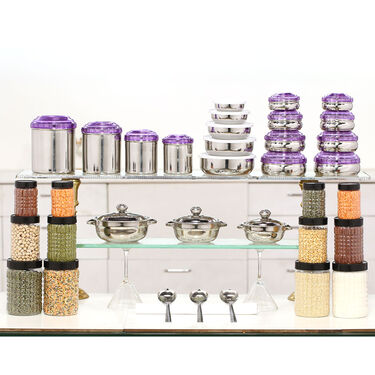 17 Pcs Colored Stainless Steel Storage Set + 3 Pcs Serving Handi Set + 3 Pcs Serving Spoon + Free 12 Pcs Storage Set (55SS2)